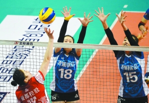 上海隊(duì)米楊、馬蘊(yùn)雯(右)雙人攔網(wǎng)。 中體在線 張立德攝