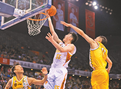 | 3月21日,深圳隊(duì)球員盧藝文(中)在對(duì)陣廣廈隊(duì)的比賽中上籃。 |