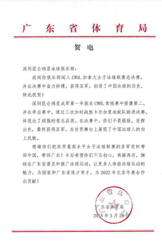 人民網(wǎng)3月26日電 北京時(shí)間3月26日零時(shí),CWHL(加拿大女子冰球職業(yè)聯(lián)賽)克拉克森杯總決賽打響,由深圳昆侖鴻星對(duì)戰(zhàn)萬錦迅雷隊(duì)。本場(chǎng)比賽,昆侖鴻星第一節(jié)先失一球,第二節(jié)由史塔克將比分扳平。加時(shí)賽中,萬錦迅雷隊(duì)斯塔西打入絕殺球,最終昆侖鴻星以1-2加時(shí)憾負(fù)萬錦迅雷隊(duì),但獲得亞軍仍然是中國冰球在世界頂級(jí)冰球職業(yè)聯(lián)賽中取得的最好成績。賽后,廣東省體育局發(fā)來賀電,對(duì)深圳昆侖鴻星奪得CWHL亞軍表示祝賀。賀電全文如下: