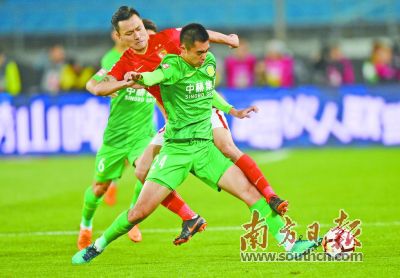北京國安隊球員張瑀(前)在比賽中防守廣州恒大隊球員郜林。新華社發(fā)