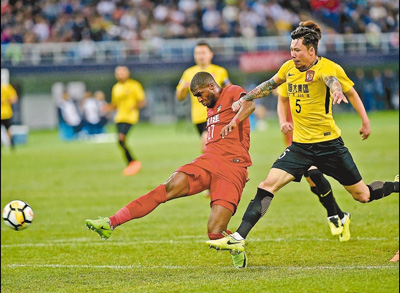 | 5月8日,天津權(quán)健隊(duì)球員莫德斯特(左一)在比賽中射門。 |