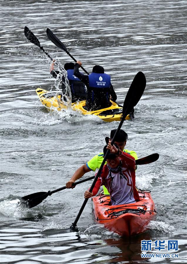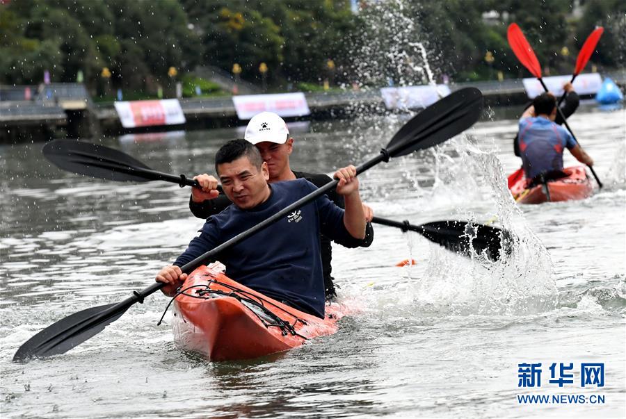 ↑11月16日,皮劃艇拔河賽選手在比賽中。 當日,2018年福建將樂皮劃艇趣味賽在將樂縣金溪河開賽。本次比賽設皮劃艇拔河、皮劃艇接力、槳板競渡3個項目,吸引了福建、吉林等國內(nèi)120名選手參與。 新華社記者彭張青攝