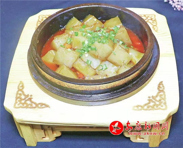 石鍋涼粉選用安康本地種植紅薯磨制的粉面,用水稀釋,起鍋燒水,等水燒開后,把稀釋好的紅薯粉倒入鍋中,順著一個(gè)方向攪拌,等到攪拌濃稠、顏色變青,倒入托盤放涼,做成涼粉。然后把石鍋加熱,在燒油鍋中放入小米椒圈 、五花肉粒爆炒,加入豆瓣醬、火鍋底料和少量清水,再倒入涼粉,調(diào)味加熱,打入薄欠即可。石鍋涼粉香辣可口、涼粉軟糯、非常下飯。