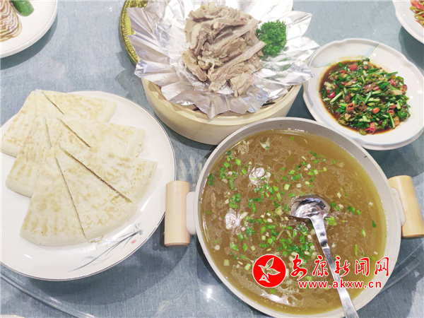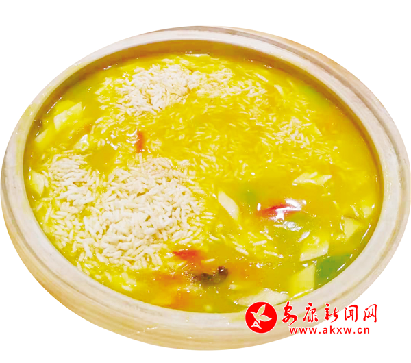 這是一道舌尖美味,制作時(shí)提前把海參、青筍、杏鮑菇、紅蘿卜切好汆水,備好墨魚花、蝦仁、棒骨高湯、南瓜泥、咸蛋黃,炸好香米,客人餐前,把炸好的香米復(fù)炸香脆裝盤,再把雞油、咸蛋黃、高湯和南瓜泥放入鍋內(nèi)翻炒,然后倒入海參、青筍、杏鮑菇、紅蘿卜、墨魚花、蝦仁等食材,燒開(kāi)勾芡,調(diào)制成濃香金湯,起鍋裝盆,端到客人餐桌,當(dāng)著食客的面將脆米倒入盛裝金湯的土盆里,攪拌均勻即可。這道菜看著五顏六色、金黃油亮,吃著養(yǎng)胃養(yǎng)顏,湯汁鮮美,營(yíng)養(yǎng)豐富。