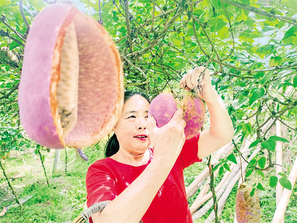 遠(yuǎn)嫁安徽的漢濱區(qū)雙龍鎮(zhèn)謝坪村魏澤會(huì),在外打拼一生,年逾花甲思鄉(xiāng)心切,于2018年回到家鄉(xiāng),在老家附近的一條山溝里,栽種了30畝八月炸。今年,八月炸喜獲豐收。走進(jìn)園區(qū),一行行、一架架八月炸藤蔓,掛滿了粉紅的果實(shí),有的裂開(kāi)果肉,像極了開(kāi)懷大笑的娃娃。魏澤會(huì)說(shuō):“今年產(chǎn)量達(dá)到3萬(wàn)公斤左右,因八月炸不易保存,謝坪村第一書記汪道軒和陜西省生態(tài)廳環(huán)境信息中心駐村干部馬祥一起,先后通過(guò)網(wǎng)絡(luò)推介、電商促銷和臨時(shí)售賣點(diǎn)等幫我們銷售。”為了最大限度增收,魏澤會(huì)已嘗試?yán)冒嗽抡ㄡ劸、榨油等,均已成功,因產(chǎn)量很小,暫未對(duì)外銷售。