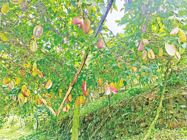 八月炸,中藥名稱“預(yù)知子”,是三葉木通的果實(shí),果子的形狀為橢圓形,長(zhǎng)得像香蕉,沿腹縫線略彎,又似腎臟。成熟后,露出里面乳白色的果肉,口感甜糯,似冰激凌,富含糖、維生素C和12種氨基酸以及人體不能合成的纈基酸、蛋氨酸、異亮氨酸、苯丙氨酸、賴氨酸和清熱利濕、活血通脈、行氣止痛的功效。