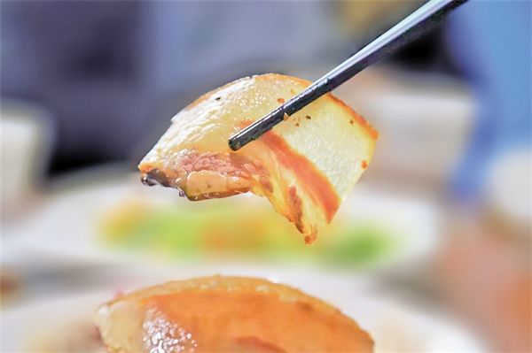 嵐皋臘味堪稱時(shí)間雕刻的藝術(shù),四季鎮(zhèn)的楊家院子里,當(dāng)?shù)孛考颐繎羧杂霉欧缰?ldquo;倒掛金鉤”。將土豬肉抹上花椒、橘子皮與苞谷酒,在巴山夜雨的潮潤(rùn)與三冬暖陽的干燥間交替風(fēng)干三年。切片蒸熟的臘肉晶瑩剔透,肥瘦相間,咸香中暗藏果木幽香,入口爽嫩宜人,配以土灶新蒸的洋芋米飯,便是客路游子最深的鄉(xiāng)愁。小城的街頭同樣藏著流動(dòng)的盛宴,冬日里挑擔(dān)叫賣的“烤紅薯”;北門坡老金家木槌現(xiàn)打的糯米飯團(tuán),在炭火上炙烤,待表面焦脆后填入芝麻糖餡;老菜市場(chǎng)樹蔭下的“漿巴饃”攤前,玉米漿發(fā)酵的酸香混著桐葉清香,勾住每個(gè)過路人的腳步。這些市井美味,構(gòu)成了嵐皋人記憶里的坐標(biāo)。