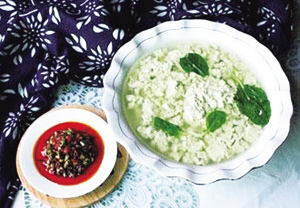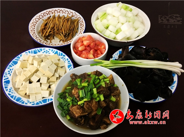 兩摻面,一半豆面與一半麥面在漢江水的調(diào)和下,經(jīng)過反復(fù)搓揉摻搟,兩種面粉化作一種新的食材——兩摻面。兩摻面摻好后醒的過程中,從酸菜壇子里撈出清……