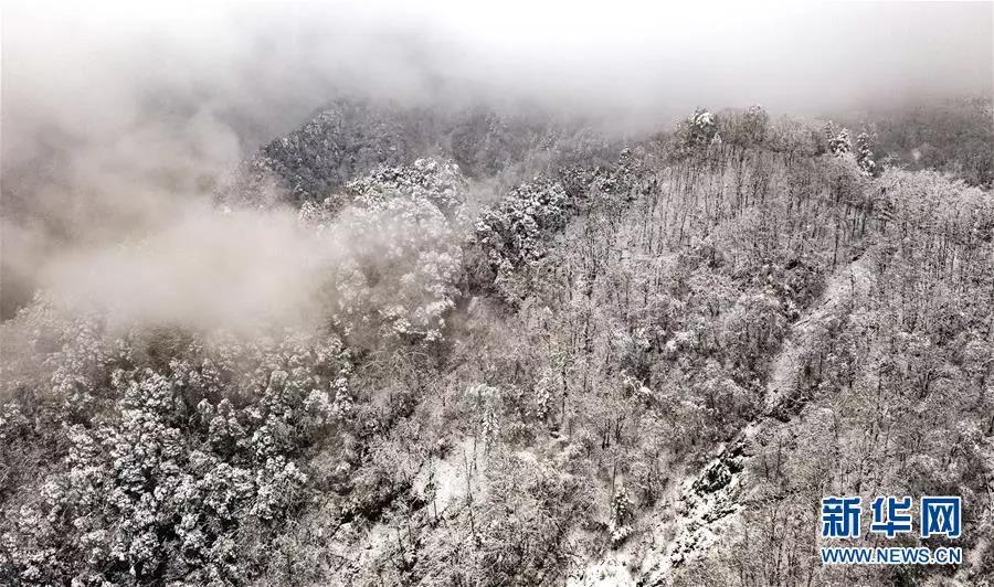11月8日無人機(jī)拍攝的銀裝素裹的鬼谷嶺國家森林公園主峰。 新華社記者陶明攝