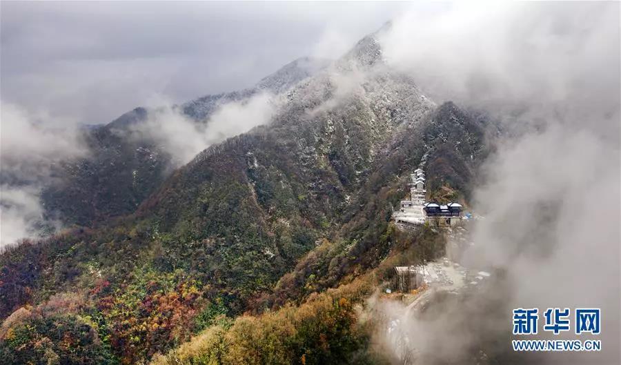 云霧中的鬼谷嶺國(guó)家森林公園山頂白雪皚皚,山腰秋色正濃(11月8日無人機(jī)拍攝)。 新華社記者陶明攝