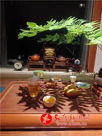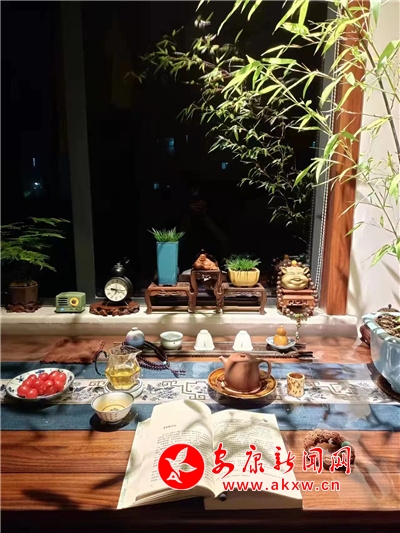 次日,我便聯(lián)系他,欲欣賞一下他的書房陳設,他欣然允之,發(fā)了書房的照片。但見潔凈的白色窗臺上擺放著清秀的文竹、蔥綠的石菖蒲、一尊笑容可掬的彌勒佛、精巧小豬擺件上系著一串佛珠,雞翅木書桌上擺放著古樸典雅的茶具旁擺置一株紫竹。彼時,許是他正品著香茗,展卷而讀,然后進入一個縱橫千萬里,上下幾千年的世界。徐徐夏風,紫竹搖曳,竹影映射于書,似也愜意。