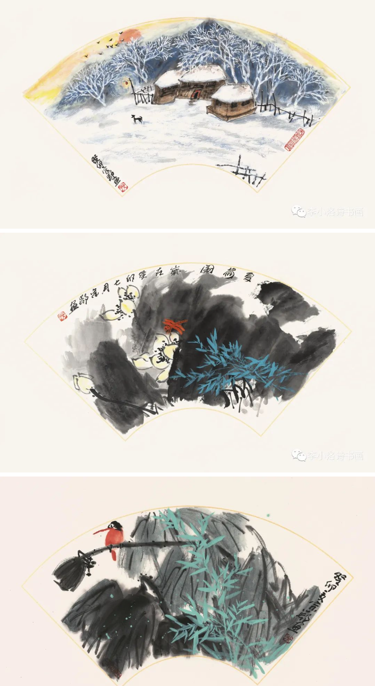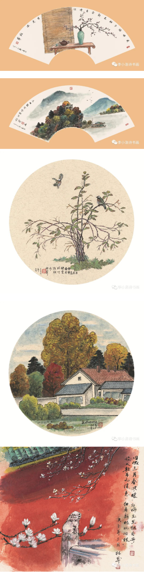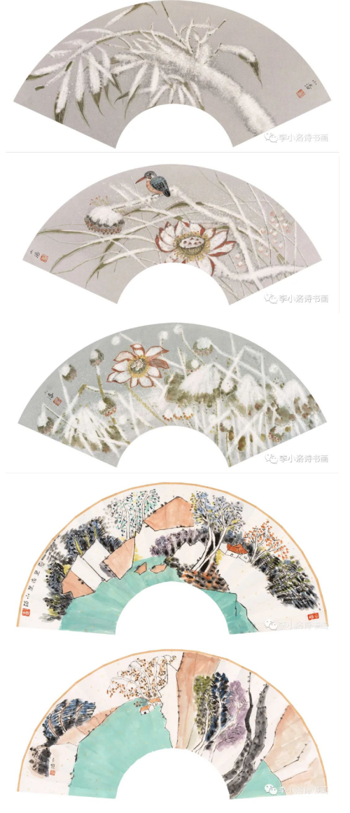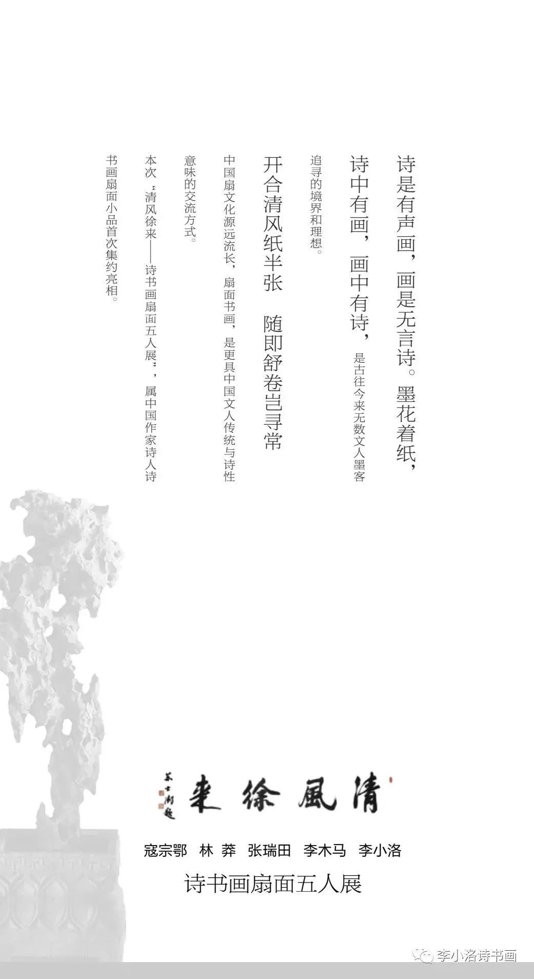 詩人寇宗鄂和林莽,均為《詩刊》編委,都曾擔(dān)任過《詩刊》的編輯部主任?茏诙踉鴰煆闹剿嫾倚毂蓖。娙伺h,詩畫兼擅。林莽作為白洋淀詩群和朦朧詩重要代表詩人,詩畫相融,桃李天下。張瑞田早年寫詩,后來多寫散文和書畫評論,是當(dāng)今活躍的評論家和書家。李木馬,李小洛,都曾參加過《詩刊》社的“青春詩會”,就讀魯迅文學(xué)院高研班,在詩歌和書畫創(chuàng)作上多年努力,取得了一定的成績……一人一格、一人一品,一扇一意、一扇一味,五位詩人作家的詩意筆墨,傳遞著各自對生活、藝術(shù)與世界的熱愛,認(rèn)知與發(fā)現(xiàn)。君子和而不同,透過一幀幀詩意盎然的扇面小品,在交相輝映的筆情墨趣中,可以看到他們相互啟迪,感染和照亮的友誼與藝術(shù)追求。